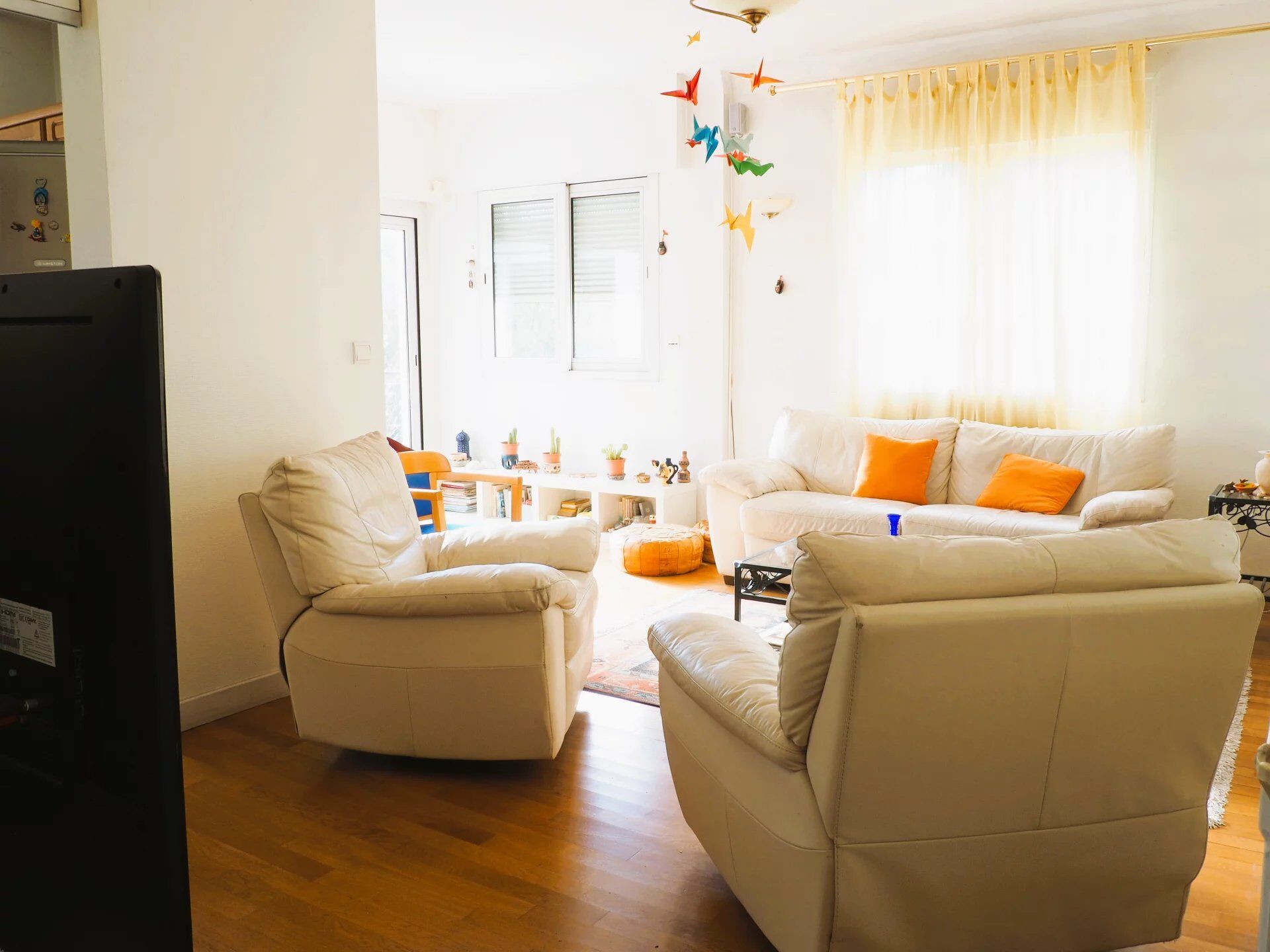 Hall d'entrée desservant le Séjour de 39m², la Cuisine équipée de 21m², 2chambres, Salle de Bains, WC alors que l'étage vous propose 2 chambres supplémentaires et une salle d'eau.